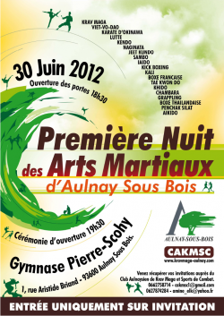 La première nuit des arts martiaux d'Aulnay sous bois se déroulera le samedi 30 juin 2012 à partir de 19H30 au gymnase Pierre Scohy. Nous participons à cette manifestation et nous pouvons vous offrir quelques invitations pour y assister Vous pouvez également consulter le site de la mairie en suivant le lien suivant http://www.aulnay-sous-bois.fr/agenda/fiche/premiere-nuit-des-arts-martiaux/?cHash=f8241ac0fa634a720ad1f50a2d6bdca1